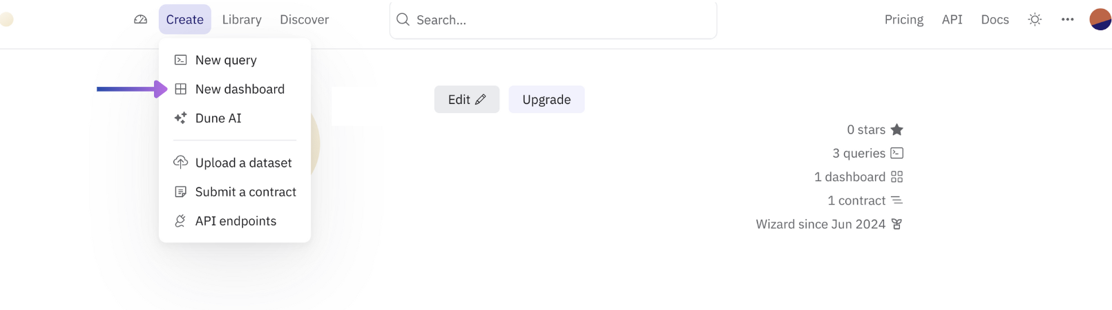 Access your account at https://dune.com/<account> and select the Create button and New query.
